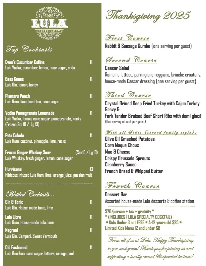 All-you-can-eat BUFFET (a variety of options will be chosen by our chef and rotated each day such as pulled pork, brisket, ham, jambalaya, gumbo, red beans & rice, grilled chicken, salad, green beans, dirty rice, corn maque choux, mac-n-cheese, chicken tenders, fries, bread pudding, king cake, bacon, biscuits, gravy, grits, chips, queso)